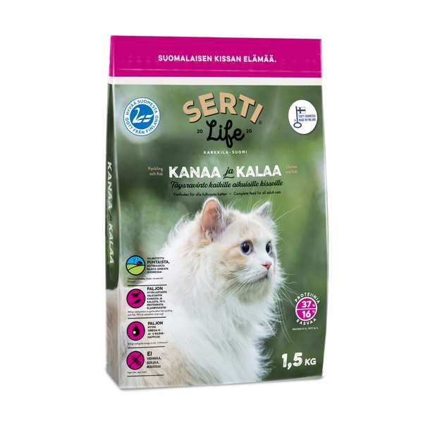SertiLife Kanaa ja Kalaa täysravinto kissoille on valmistettu Suomessa, puhtaista kotimaisista raaka-aineista. Ei sisällä lainkaan keinotekoisia makuaineita tai väriaineita. Valmistuksessa ei ole käytetty viljoja, soijaa eikä maissia.