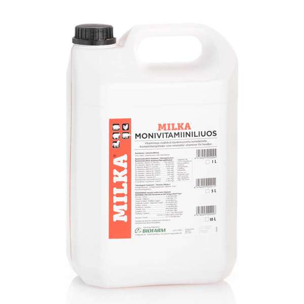 Milka multivitaminlösning innehåller alla de viktigaste fettlösliga vitaminerna A, D, E och K, samt massor av vitaminer från B-gruppen. Framför allt räcker inte produktionen av vitamin B hos kalvar och smågrisar för att tillfredsställa tillväxtens behov, så det är viktigt att intaget av vitamin B säkras med Milka multivitaminlösning.